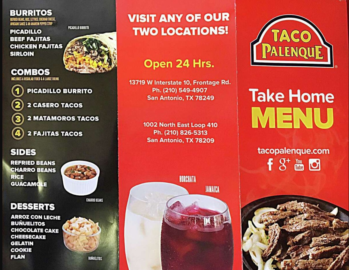 At Taco Palenque Brook Hollow & 281, we bring the bold and vibrant flavors of Mexico to Hill Country Village, TX, with a menu packed full of authentic dishes that satisfy day or night. From our famous breakfast tacos to sizzling fajitas, cheesy quesadillas, and freshly prepared salsas, every bite is made with high-quality ingredients and traditional recipes. Whether you’re stopping in for a quick lunch, enjoying a family dinner, or grabbing a late-night bite through our drive-through, our 24-hour service ensures your favorite Mexican flavors are always ready. Explore our full Taco Palenque Brook Hollow & 281 restaurant menu and taste the tradition in every meal.